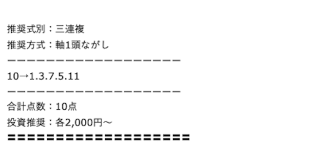 買い目が少ない分、1点あたりの推奨投資金額は5,000円以上と高めに設定されています。