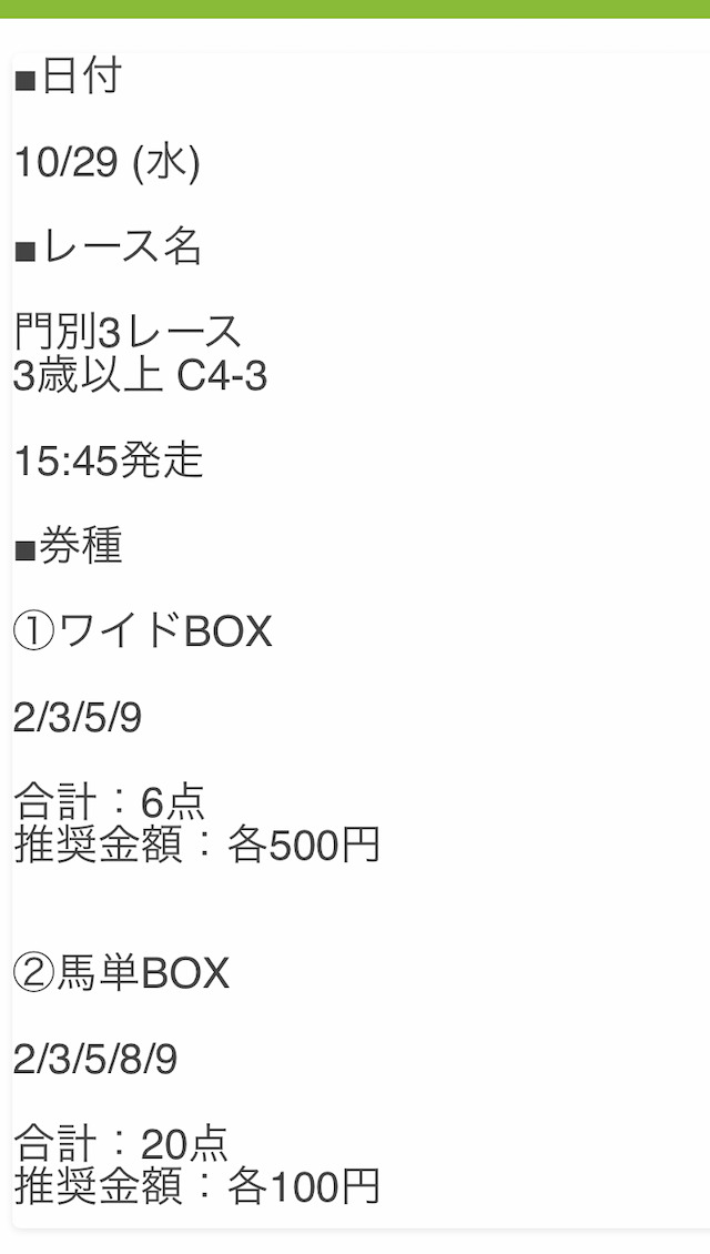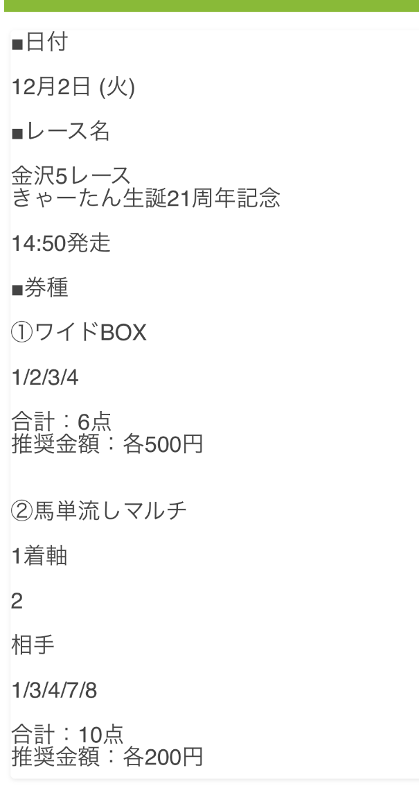 無料予想 有料予想 稼ぎやすさ 安定感 ★4 ★1 ★4 ★4 コスパ 使い勝手 サポート コンテンツ ★4 ★5 ★4 ★4 個人的にはかなり好きです!まだ2回しか使ってませんが2連勝の8万プラス。3連複だけ使ってこれだから配当面もかなり期待できるのではないかなと。今度3連単でそのまま乗ってみようと思うので、また結果次第で口コミ入れようかなと。