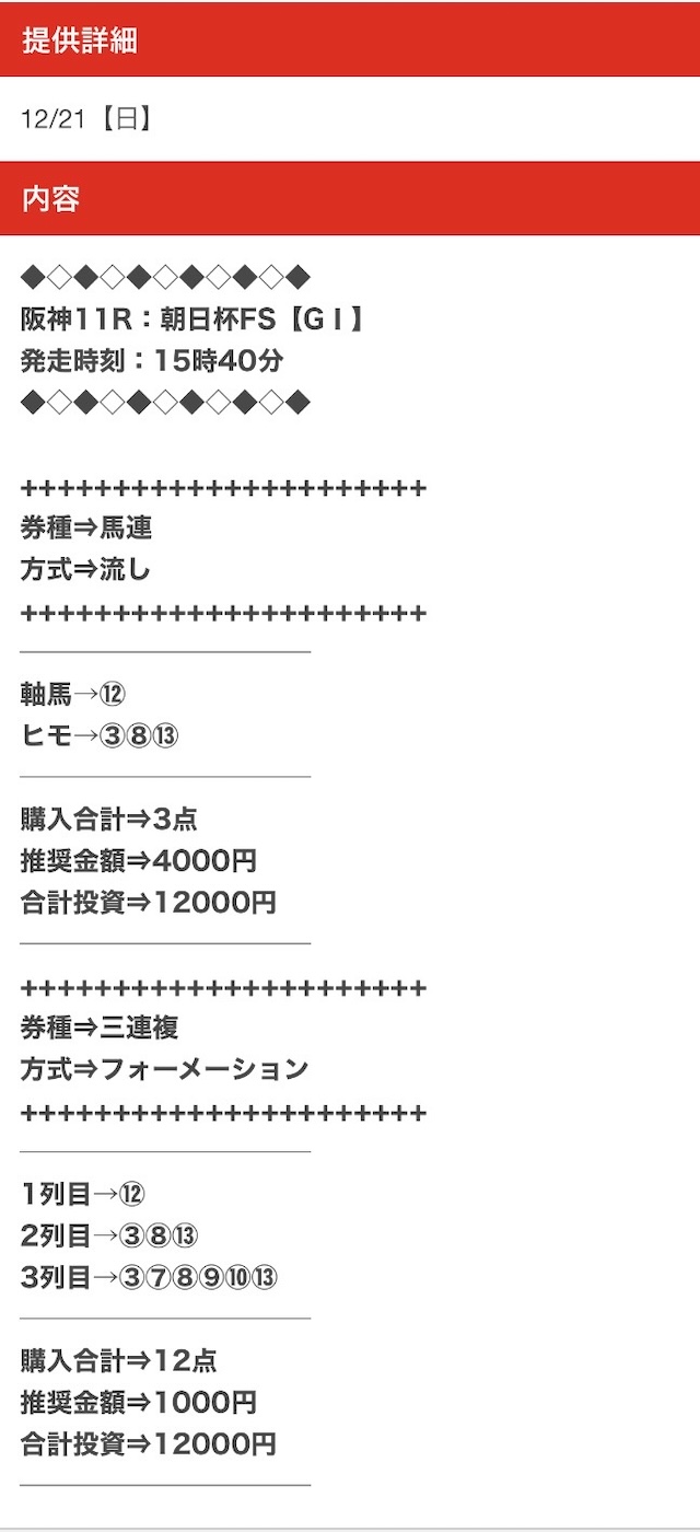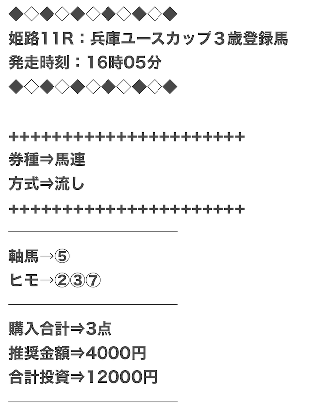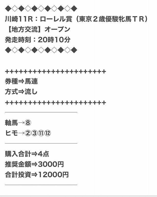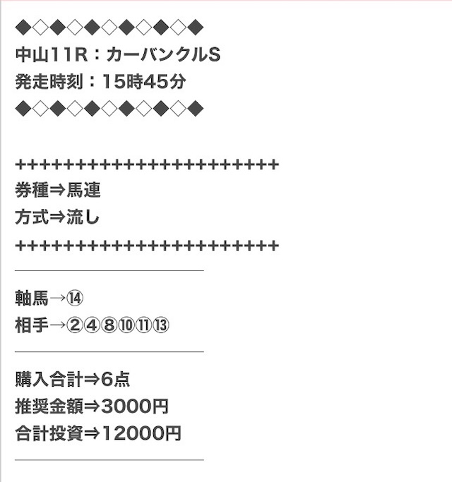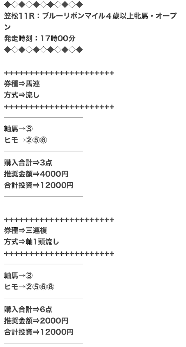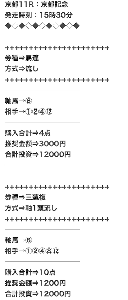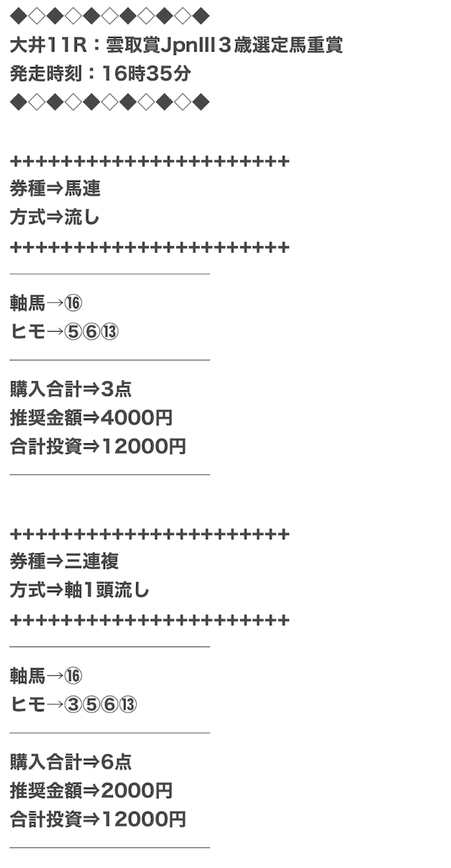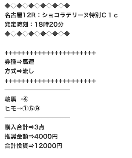 券種は馬連と3連複がメインで、価格は12点で収まるような買い目を公開。