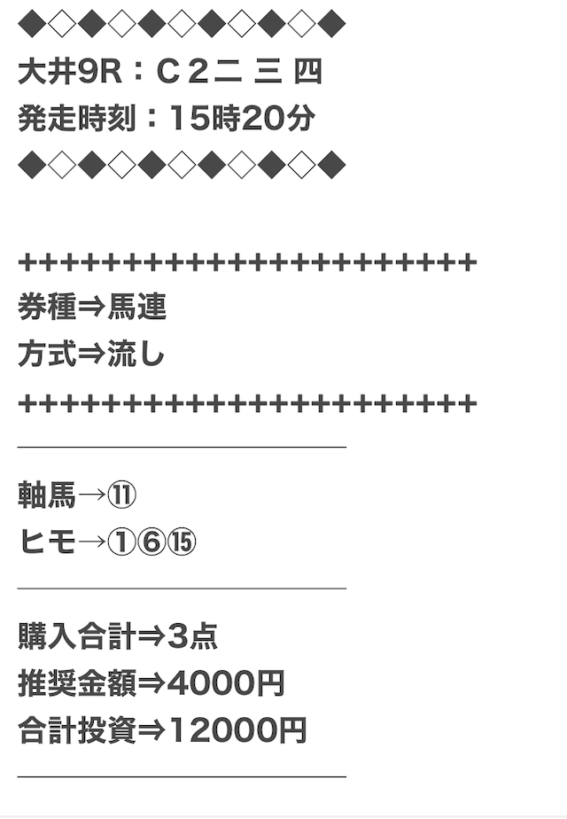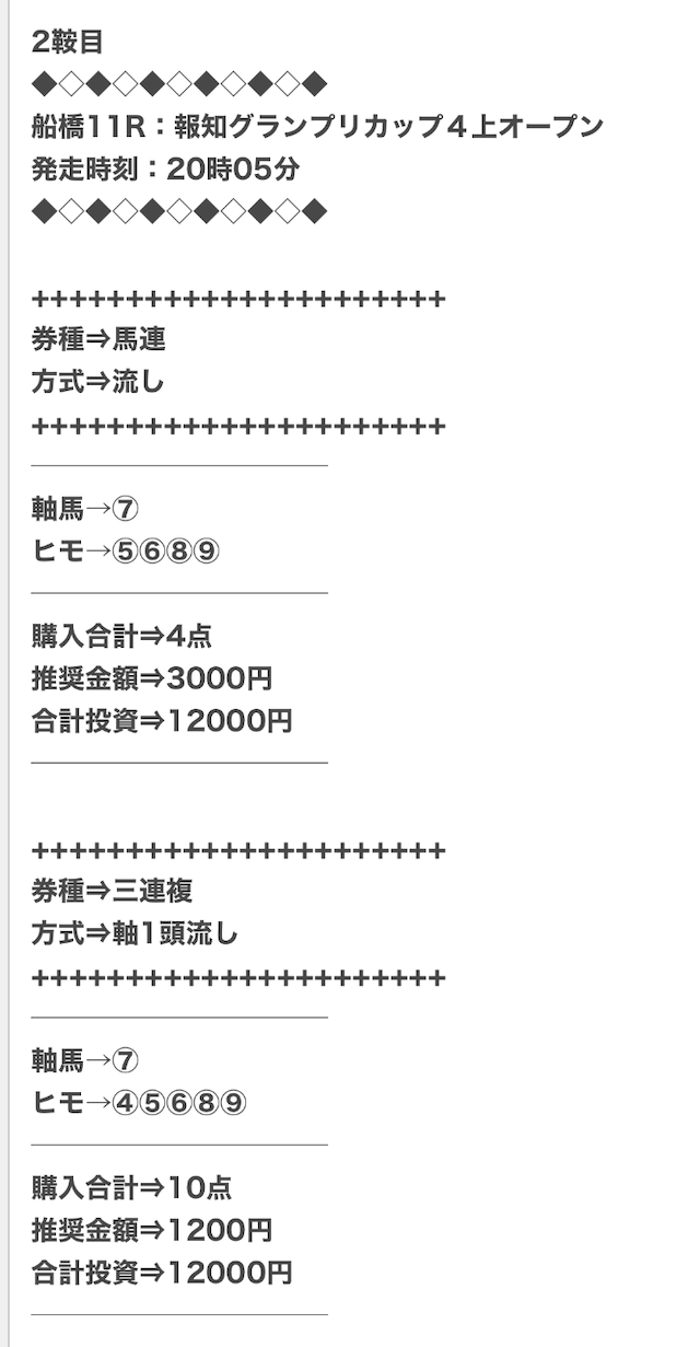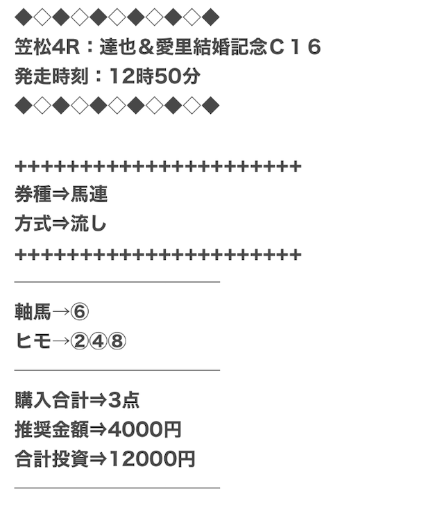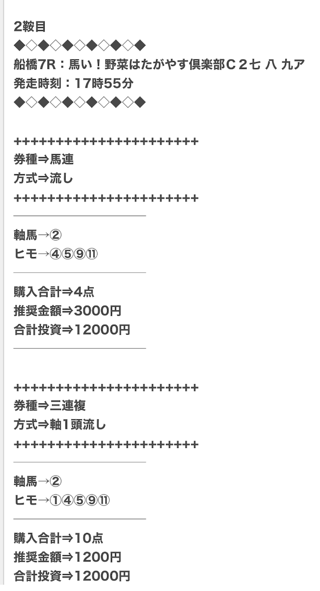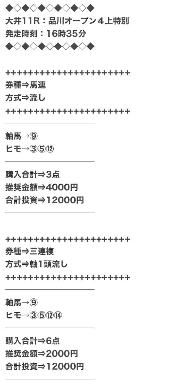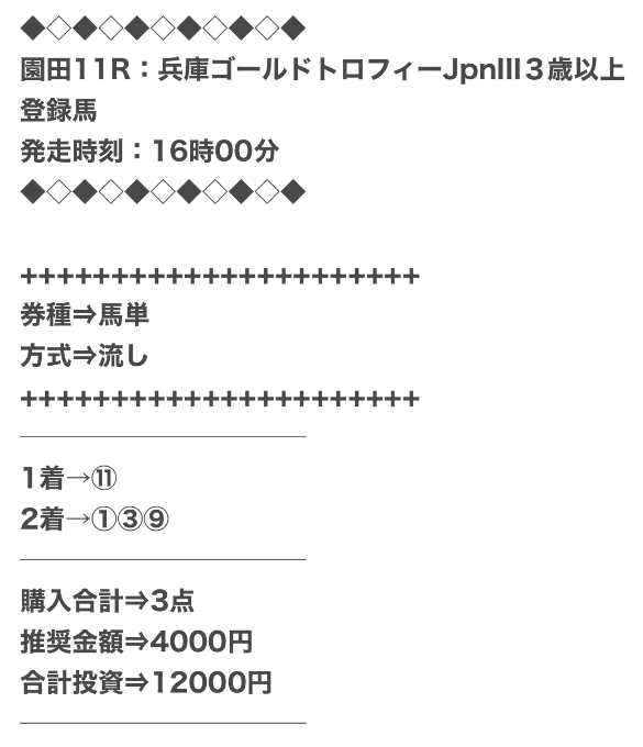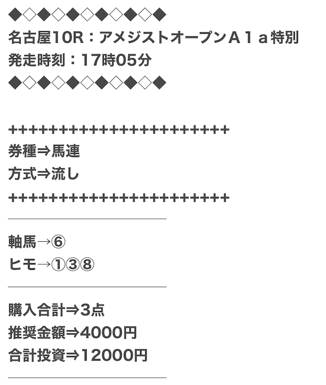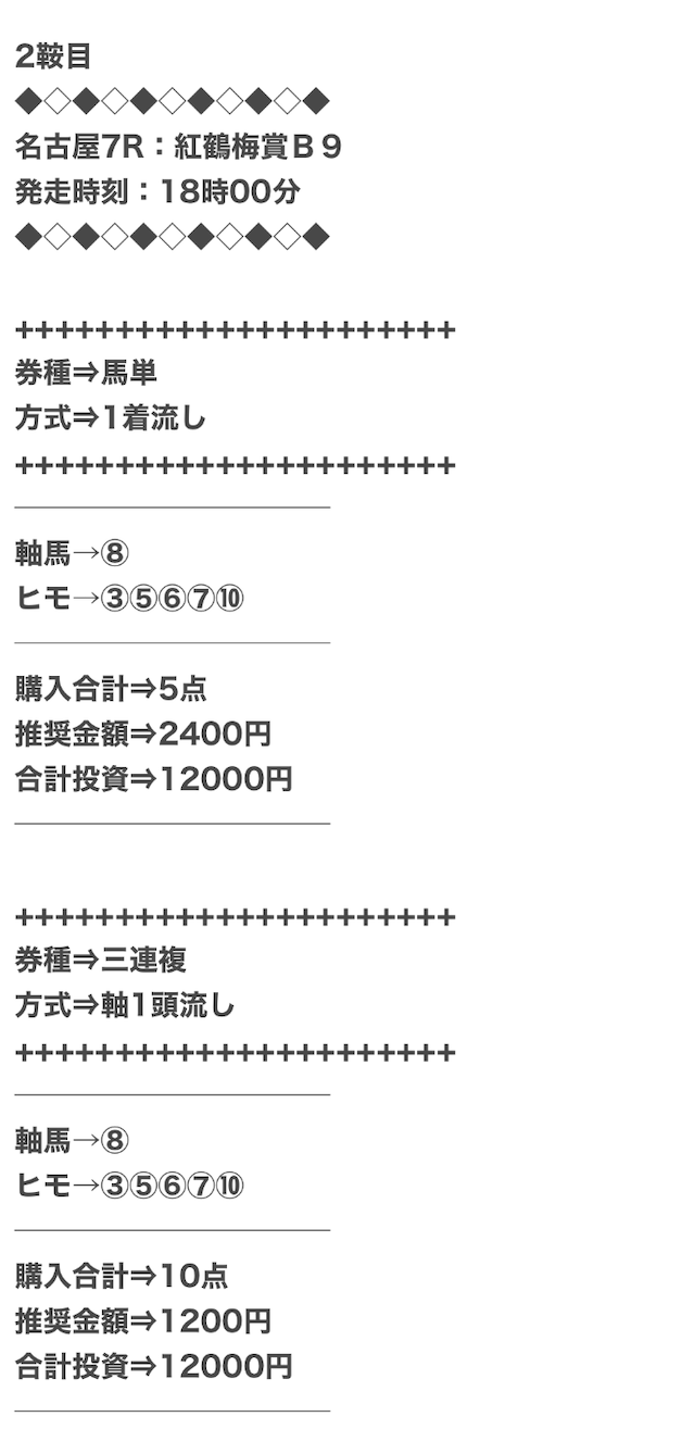 券種は馬連と3連複がメインで、価格は12点で収まるような買い目を公開。