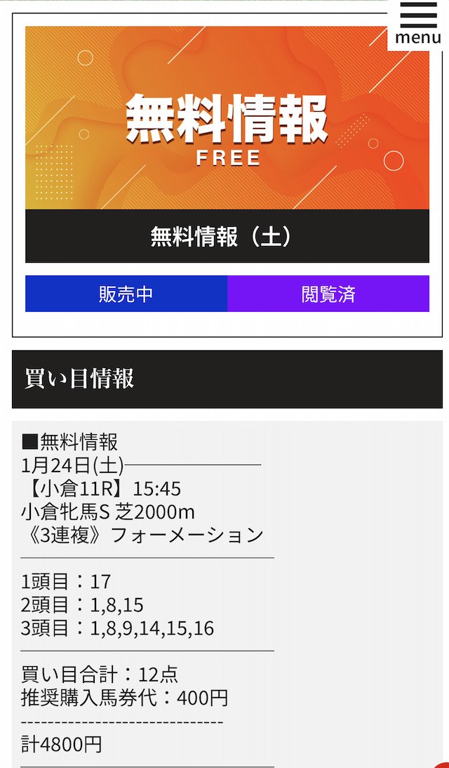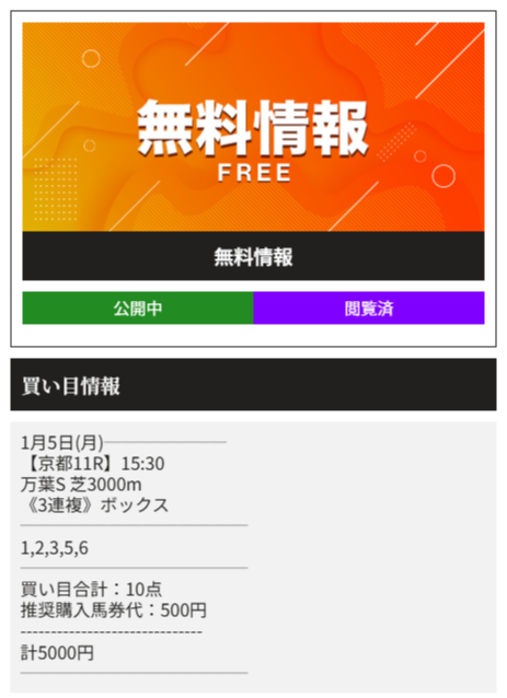 基本はその週のメインレースの予想を公開し、地方競馬予想は公開されません。