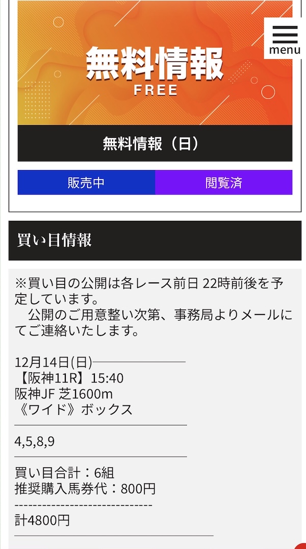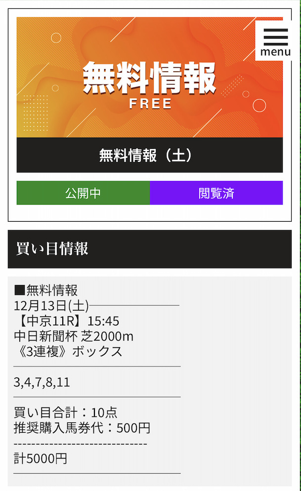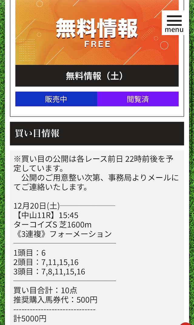 基本はその週のメインレースの予想を公開し、地方競馬予想は公開されません。
