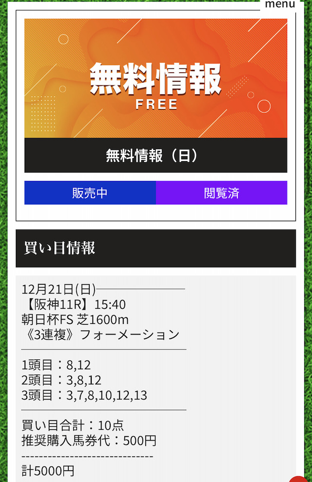 - 有料予想の払い戻し性能が高くそのうえで全戦全勝している