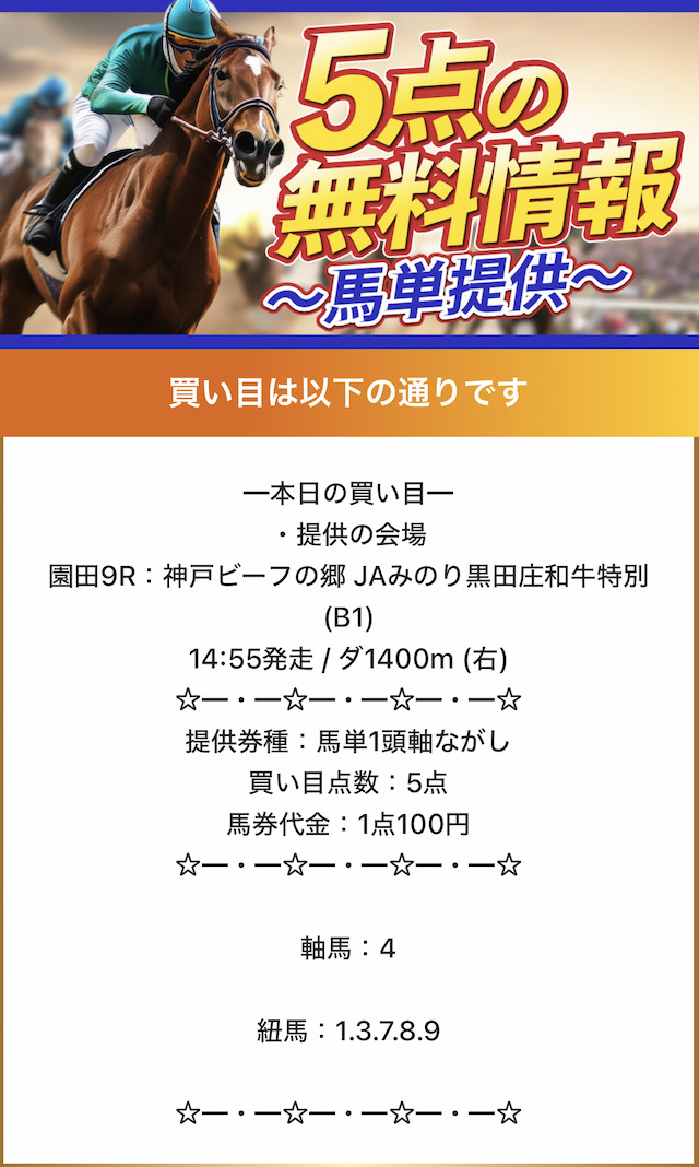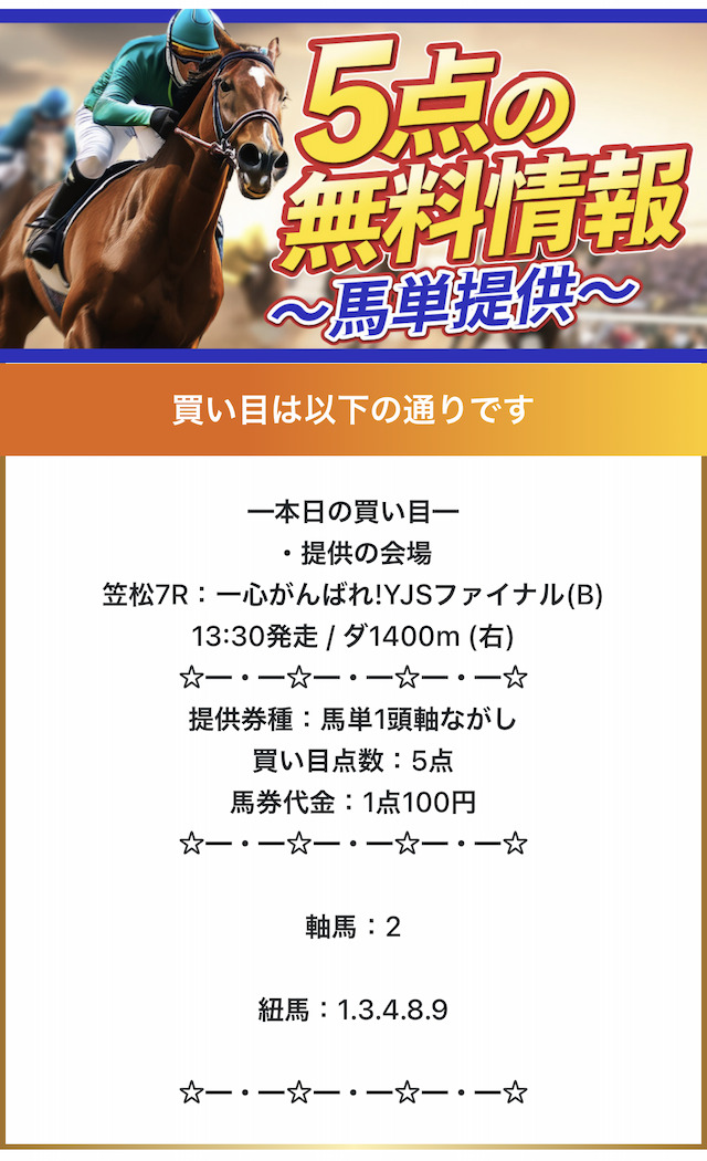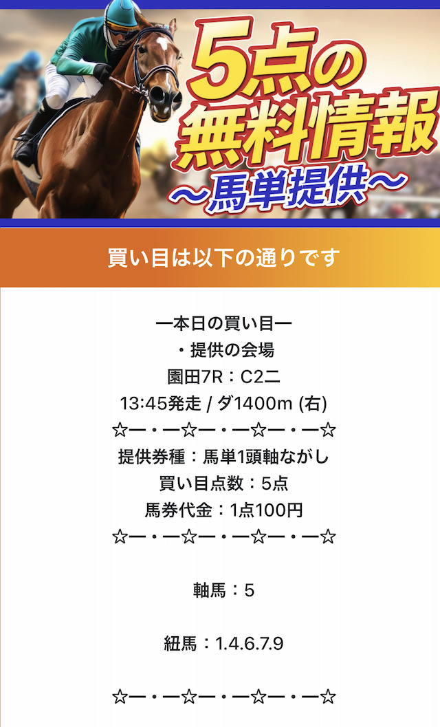 他のサイトと全然違うのが的中の精度の高さですね。 無料情報とは全く違うプランの質の高さです。