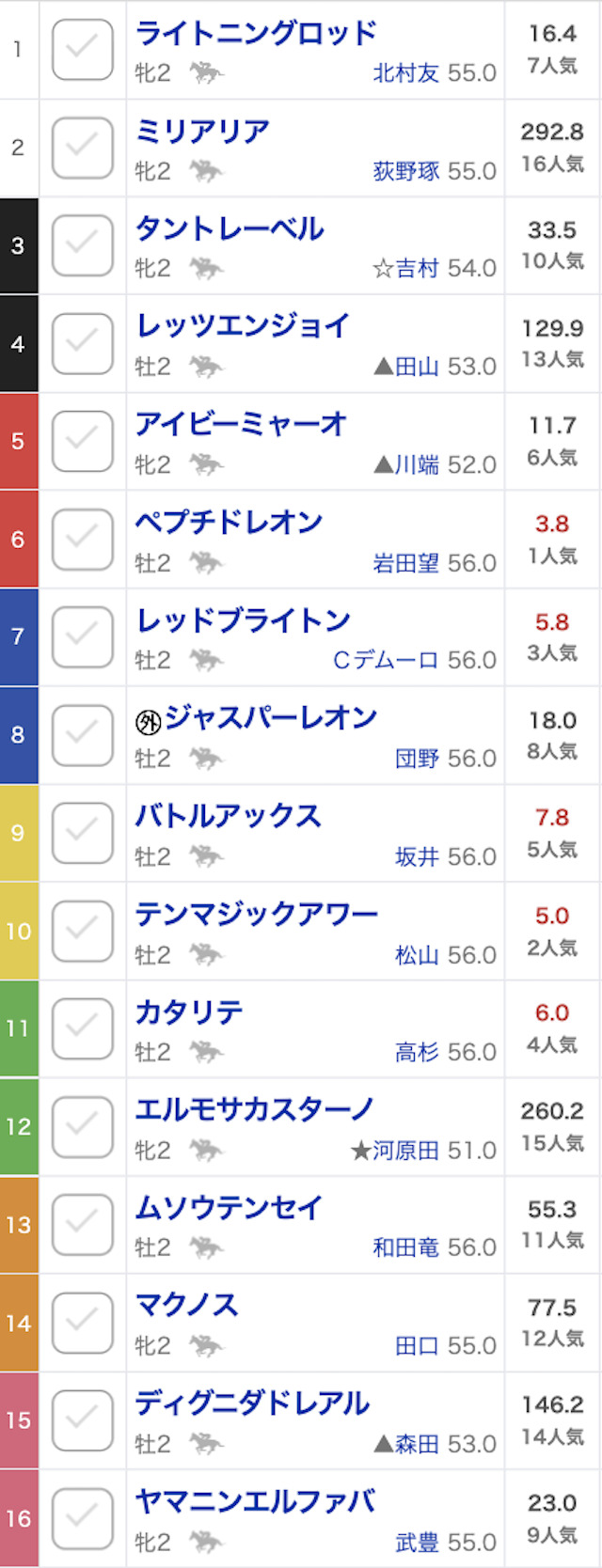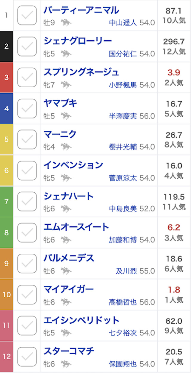 軸と紐馬が指定されているため、買い目通りに予想に参加していきます。