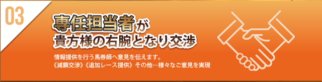 中でも特徴的だと思ったのは“専任担当者が馬券師と交渉を行ってくれる”点。