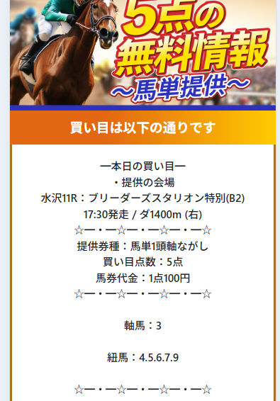 - 無料予想では馬単5点という絞った予想で好成績をキープ!