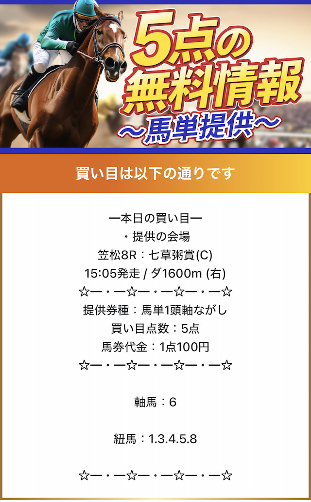 手間はかかりませんので、ぜひ気軽に登録して予想を受け取ってみてください。