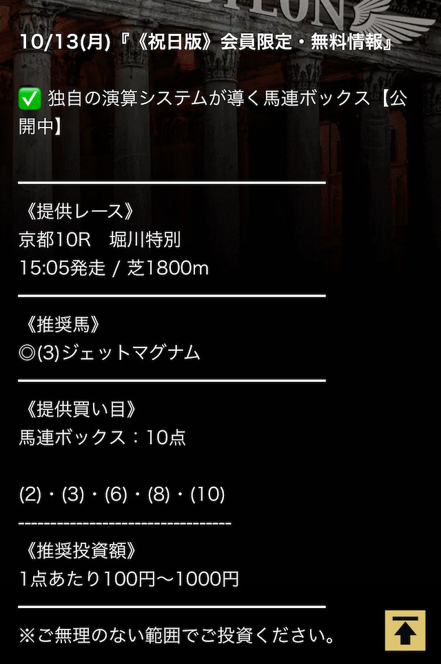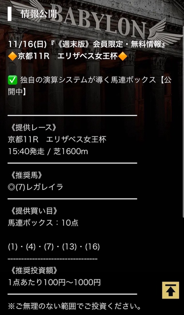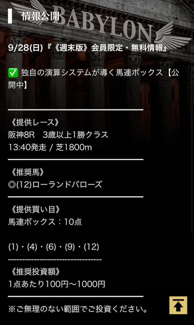 これらを徹底的に分析したうえでバビロン独自の的中ロジックを当てはめ、好走が期待できる馬を算出しているとのことでした。