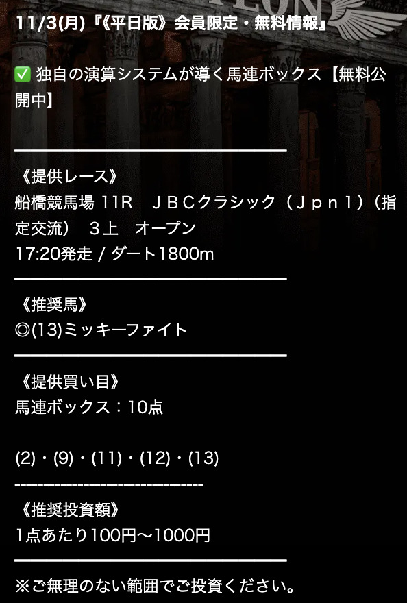 予想を受け取るだけなら無料でできますので、まだ利用していない方はこの機会にチェックしてみることをオススメします!