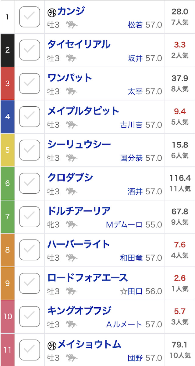 また、相手も上位人気は2番人気の②コスタボニータのみで、荒れた展開も見越しているように見て取れます。