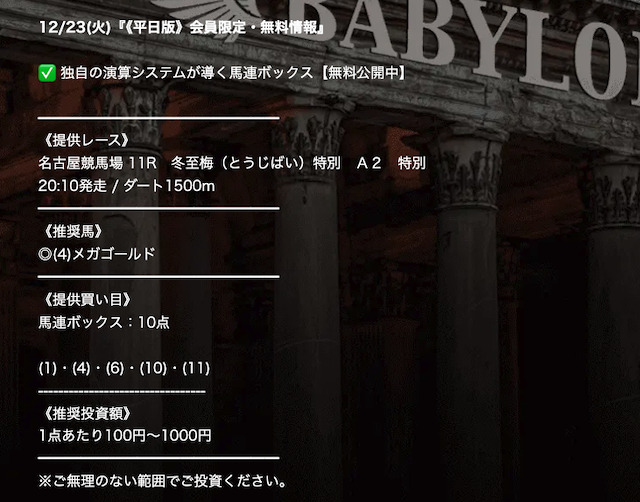 3連単予想でとにかく優秀な戦績を残したバビロン。