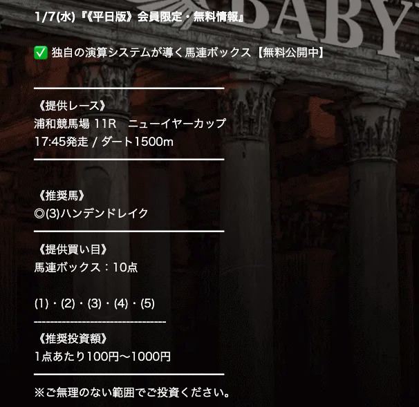 これらを徹底的に分析したうえでバビロン独自の的中ロジックを当てはめ、好走が期待できる馬を算出しているとのことでした。