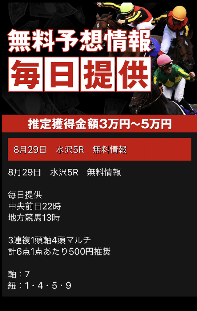 無料予想を毎日提供ってのがありがたい。予想の上手いサイトって提供鞍数が少ないんだけど、馬券闘資倶楽部は提供数・精度共に文句なし。これまで使ってたどのサイトよりも効率よく稼げてる。担当の黒田さんにはいつも丁寧に対応してもらって助かってます。
