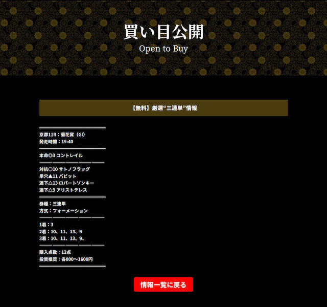 注目度の高い重賞予想を当てたことはもちろん、しっかり利益に結びついている点は高く評価できるポイントです。