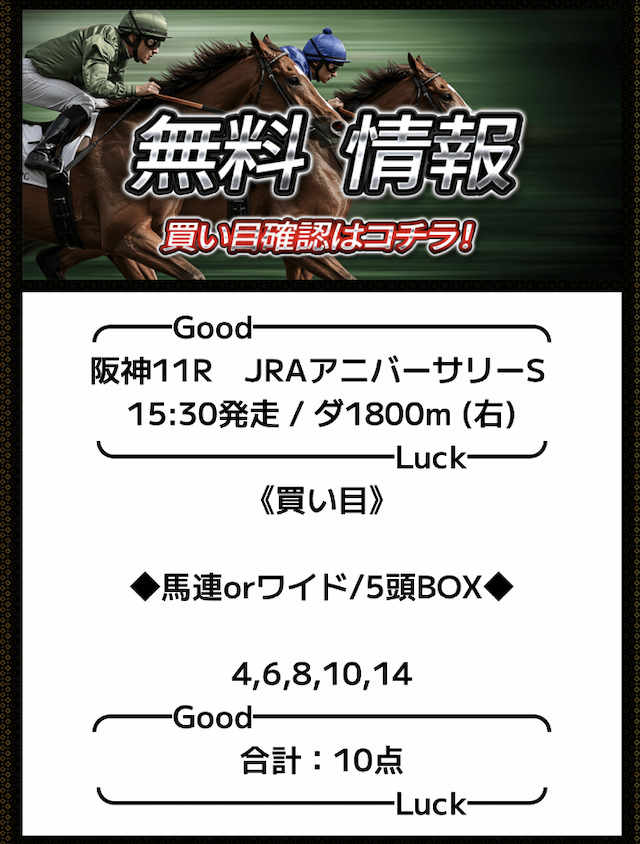 ここ、結構前から使ってるんだけど、メインレースとか重賞しか予想公開しないから初心者は絶対使ったほうがよいよ。普通に競馬のスタートとして使える。結構予想も当たるしね。