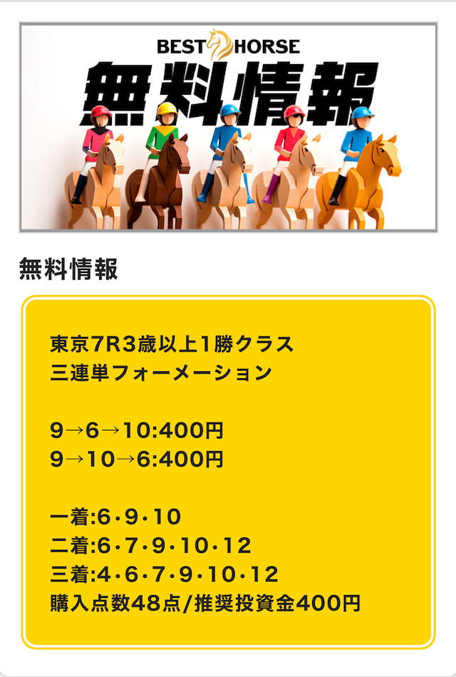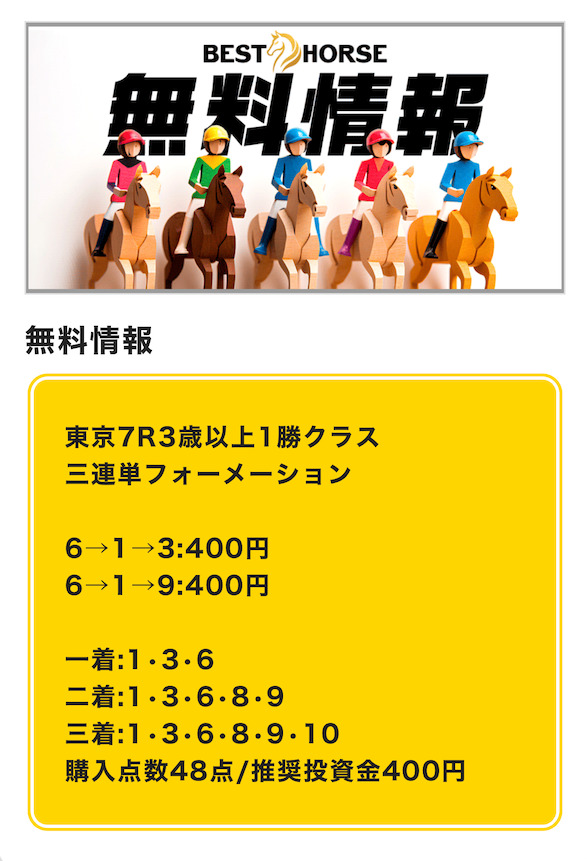 どうやらこの手法で公開する予想の精度は、ベストホースいわく完璧だそう。