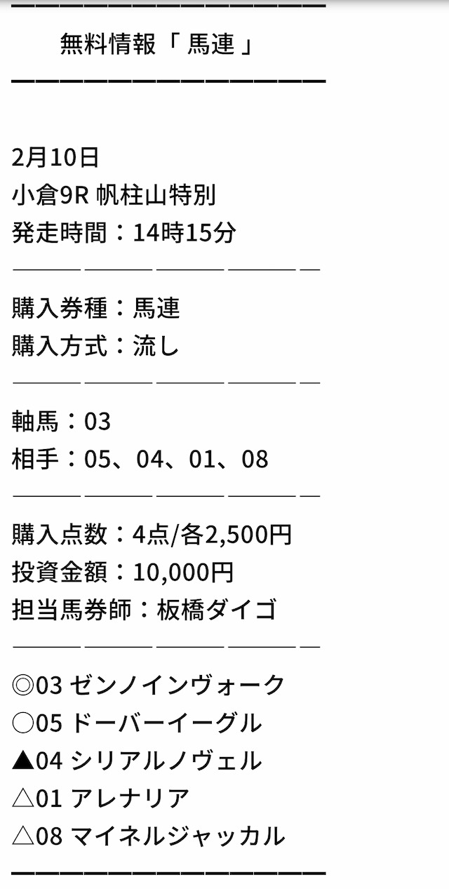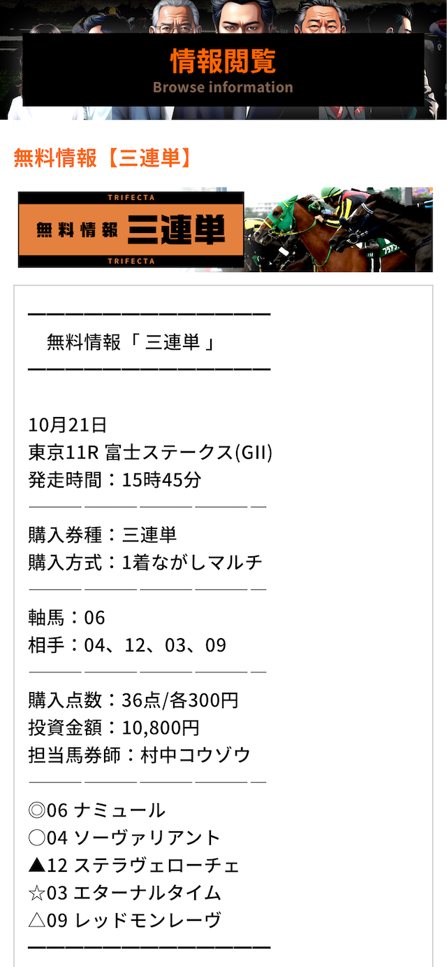 それでは早速、私がこれまでに参加した有料情報の結果と実際に公開された買い目をご紹介します!