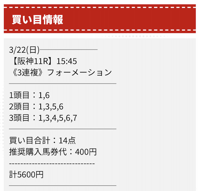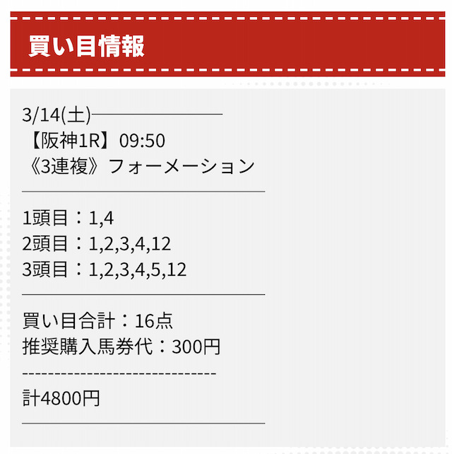 | 買い目点数 | ワイド:1〜2点 3連複:12〜18点 |