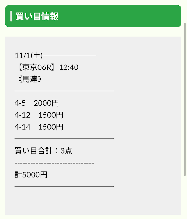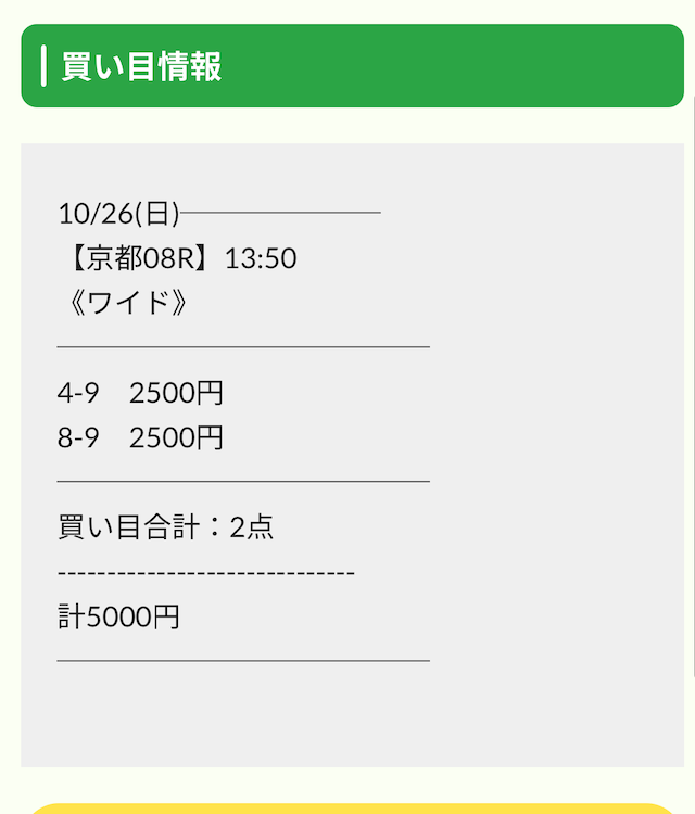 無料予想 有料予想 稼ぎやすさ 安定感 ★5 ★3 ★3 ★5 コスパ 使い勝手 サポート コンテンツ ★4 ★5 ★3 ★4 先週登録して5回無料予想で勝負しました。結果は4勝1敗で8万円勝ちとかなりいい感じです。まだ使い始めて間もないのでデータは少ないですが、今後も安定して稼げそうな気がします!