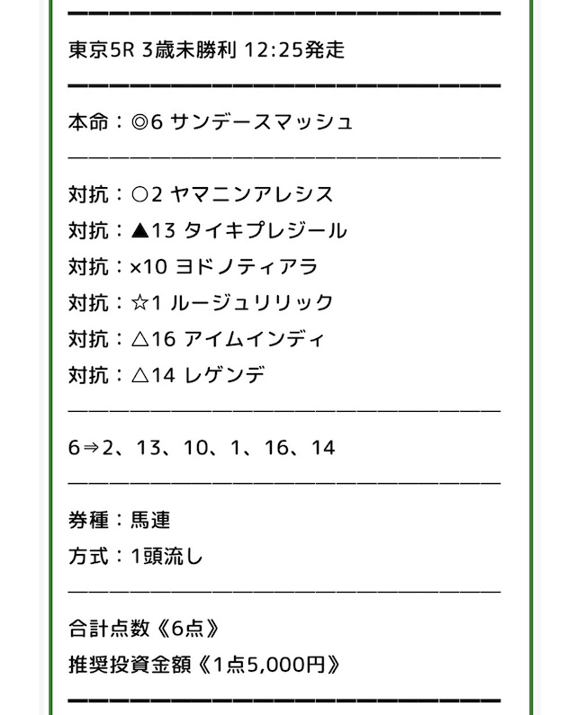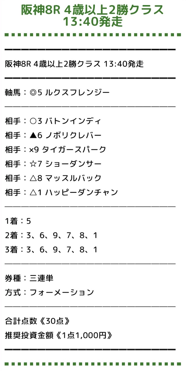 みどりの的中らんどの無料予想は、5券種(単勝・複勝・馬連・三連複・三連単)から買い目が公開されました。