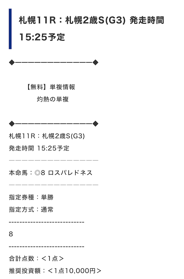 正直、無料でここまでやってくれるとは思ってませんでした。 馬単3点勝負、少頭数とはいえ的中は見事。 配当も20万円超えと申し分なし。毎週しっかりチェックすべきサイトだと再認識しました。