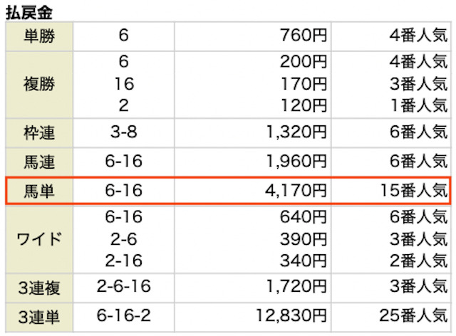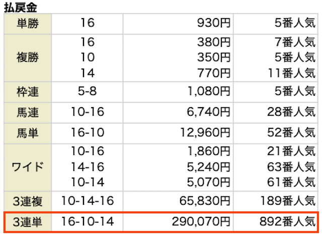 | ⑮-②-⑯(19番人気) | ⑯-⑩-⑭(892番人気) |