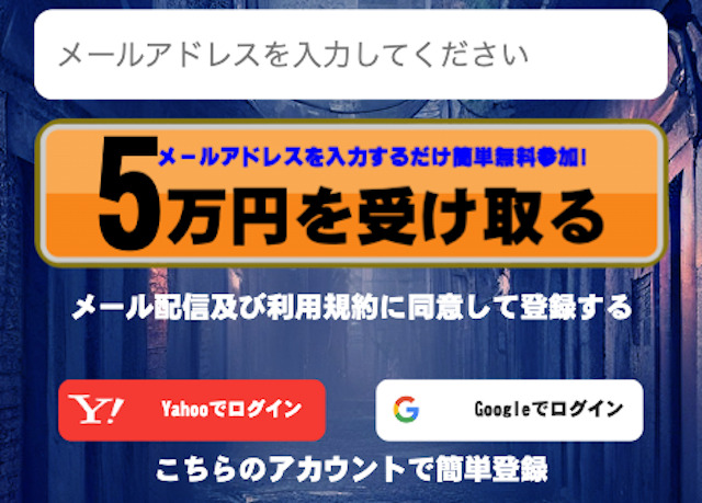 メールアドレスからのご登録はフォームにメールアドレスを入力後『5万円を受け取る』をタップ。
