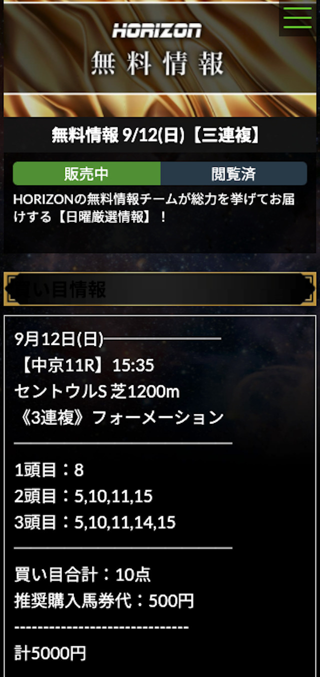 ホライズンの無料情報は土日各日2レース分の予想がログインページ内で公開されます。