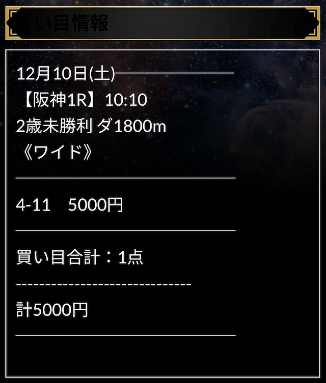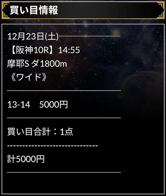 - 12月23日 阪神10Rワイド6-16,2-6,2-160円 – 5000円= -5000円✕