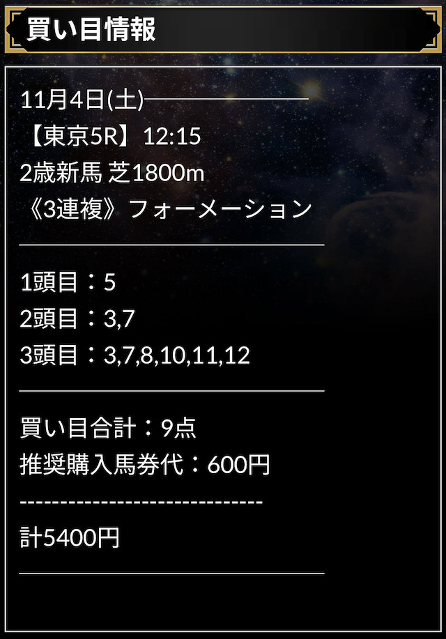 - 11月4日 東京5R三連複3-4-70円 – 5400円= -5400円✕