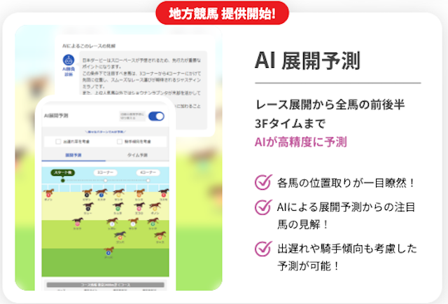 | AI展開予測 | レース展開から全馬の前後半3Fタイムまで AIを活用して高精度に予測 |