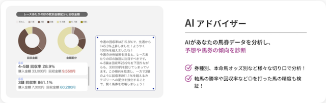 | AIアドバイザー | AIがこれまでの馬券データを解析し 予想や馬券の傾向を診断 |