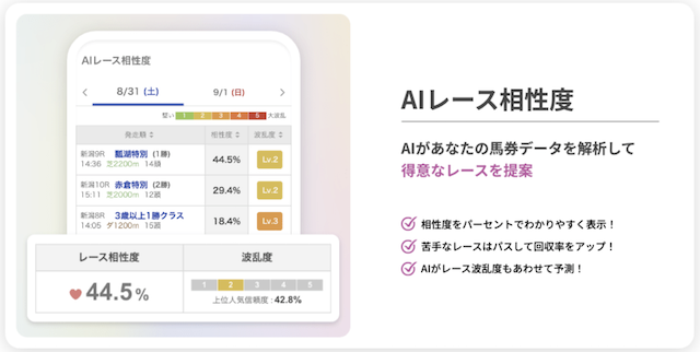| AIレース相性度 | AIがこれまでの馬券データを解析し 得意なレースを提案 |