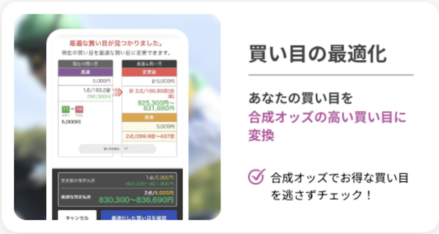 | 買い目の最適化 | 合成オッズの高い買い目に変換 お得な買い目を作成できる |
