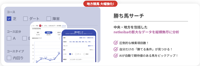 | 勝ち馬サーチ | 中央・地方問わず AIが期待値の高い馬をピックアップ |