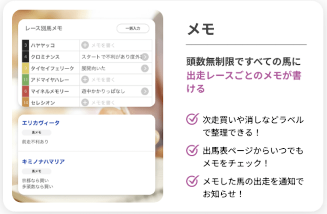 | 馬メモ | 頭数無制限ですべての馬に 出走レースごとのメモを残せる |