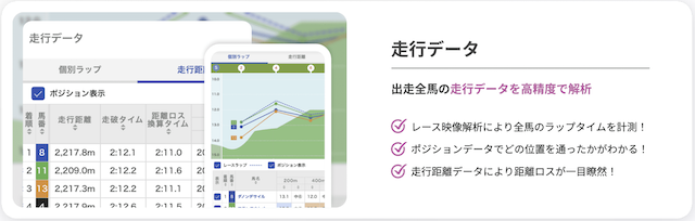 | 走行データ | 全出走馬の走行データを高精度で解析 全馬のラップタイムまで計測 |