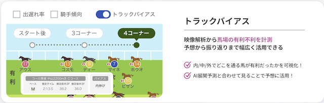 | トラックバイアス | 解析した映像から馬場の有利不利を計測 AI展開予測と組み合わせることで予想に活用できる |