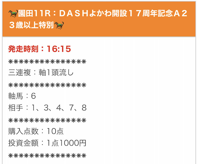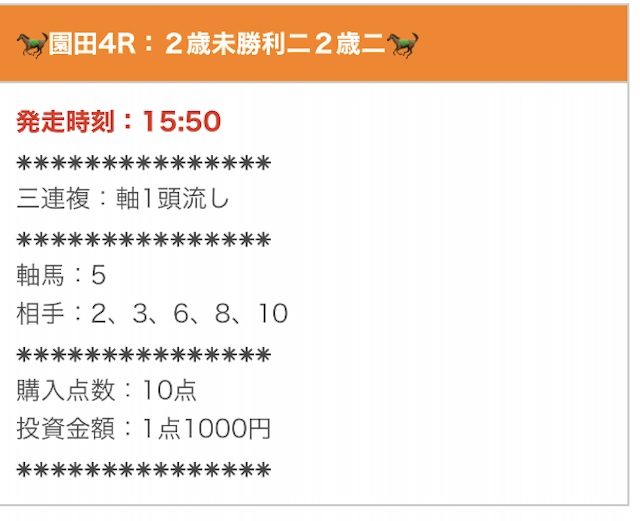 | 有料予想 | ・購入した全戦績と総評 ・過去一番のベストBUYプラン ・有料予想のラインナップ |