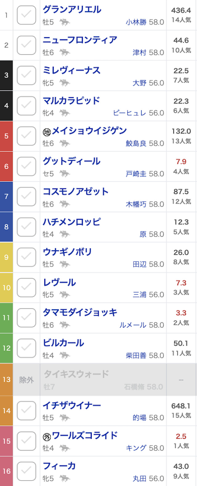 軸には7番人気③ミレヴィーナスと1番人気⑮ワールズコライドが選出。