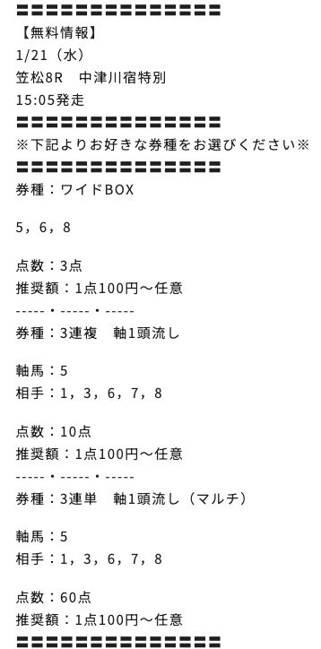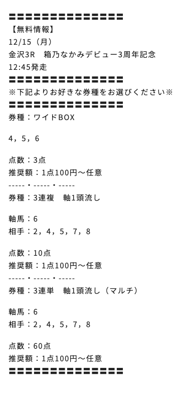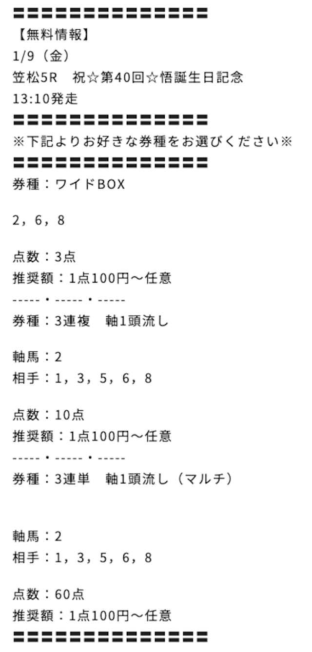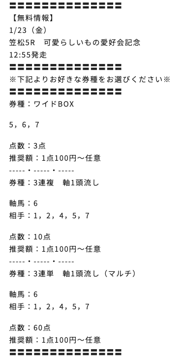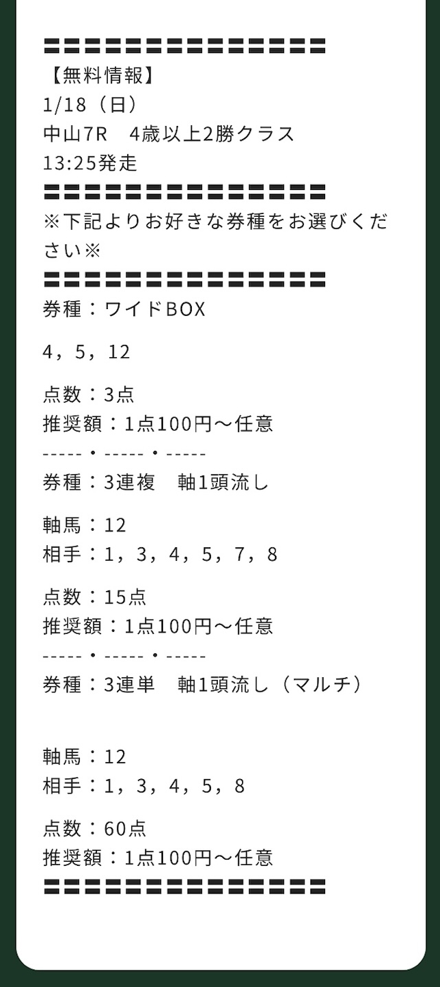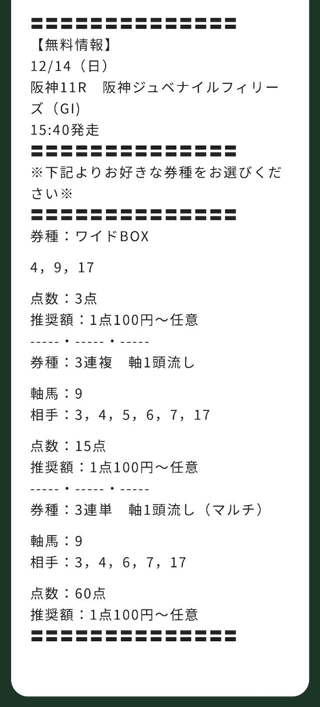 券種が易しいものが多いので、重宝させてもらってます!特に、個人的なワイドの勝率は8割超えと、ワイドの券種が公開された日はレースを参加せざるを得ません!