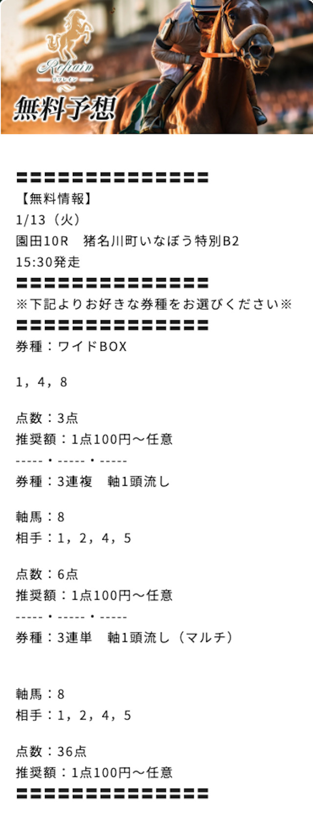 今ちょっと話題のリフレインに登録。無料予想複勝・ワイド・3連複は面白いなって思ったけど、正直3連複だけ買っておけば良いかなって思います(笑)!肝心の予想ですが、現在4連勝中!予想精度は間違いなく高いんで今後も利用していきます!贅沢を言うならもう少し配当狙いの予想も欲しいかも。