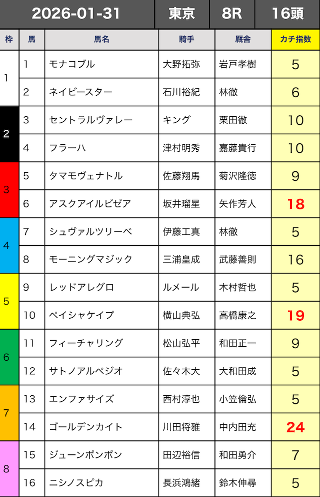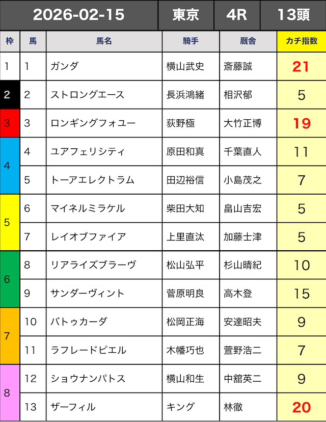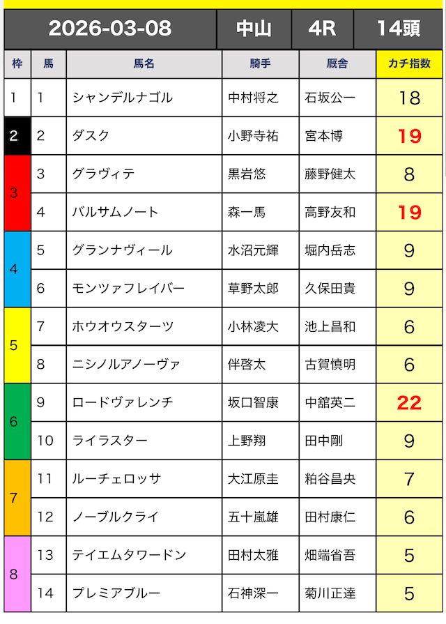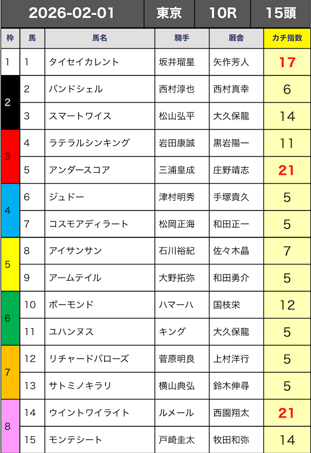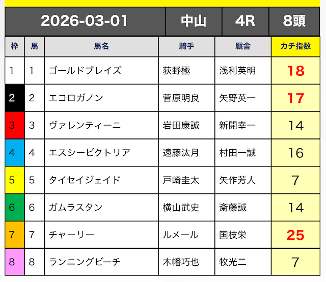 “カチ指数”という独自の精査によって算出された数字を見て有力馬を判断できるという、珍しい予想スタイルです。