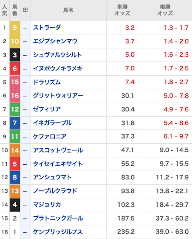 | ⑩エジプシャンマウ 予想印点数:4点 | 2番人気 | 3.7倍 |