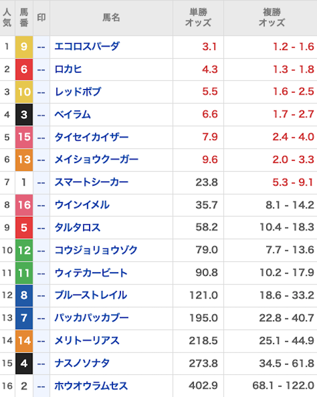単勝オッズ一桁台は拮抗していますが、7番人気以降からはオッズ差がしっかりとあります。