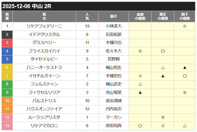 新馬戦というレース条件から単純なオッズが当てにならないことを加味し、カチウマの定理の強みとしている”他要素の数値”から3頭の人気簿を導き出しているのか。