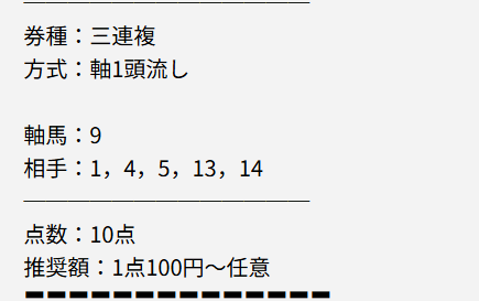 全体で見ると、鉄板決着まではいかない堅め寄りの決着を想定しているような買い目と言えます。