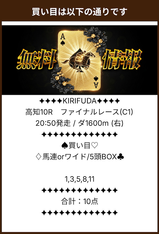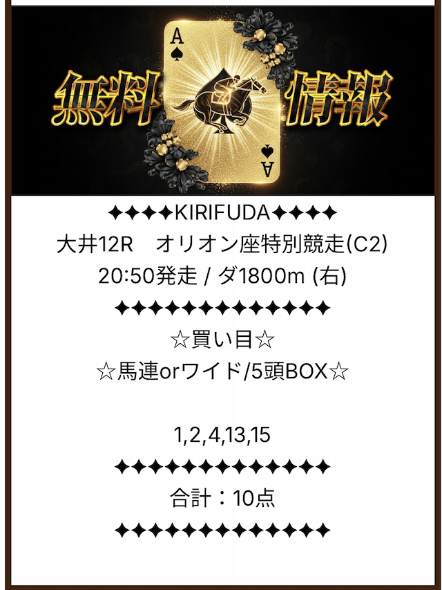 まずは実際に公開される買い目の例をご覧ください。