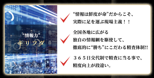 「味方に付けたその日からあなたの景色が変わる」と豪語するほど自らの予想精度を自負しており、その独自に組織体制によってそれを実現させているようです。